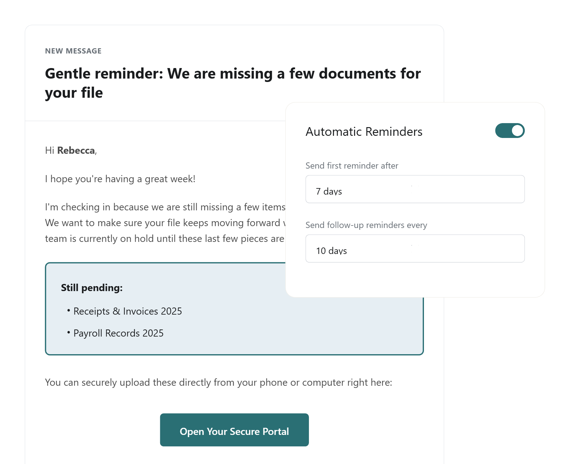 Recover hours of billable time previously wasted on manual follow-ups. Set your communication schedule once, and let the platform do the nagging for you.